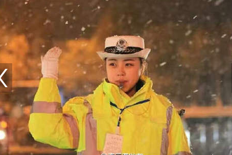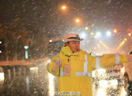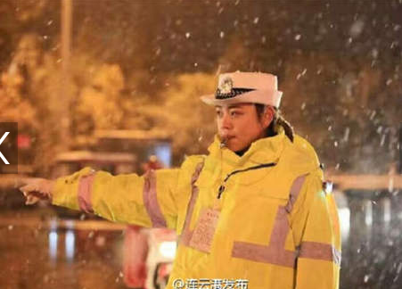江蘇連雲港(gǎng)氣質女(nǚ)交警(jǐng)雪中指揮交通被拍圖 身穿新式熒光(guāng)防寒服(fú)