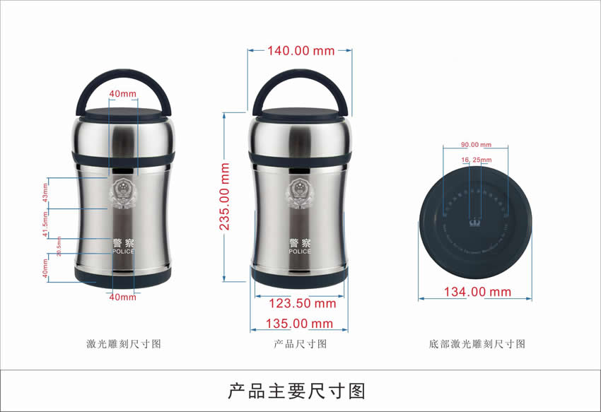 ◎ 款式時尚、高雅、攜帶方便、保溫效果持久 ◎ 保溫保味,讓您享受飯菜(cài)的原有馨香味道 ◎ 密封蓋采用ABS樹脂(zhī)(食品接觸用),耐高溫安(ān)全衛生 ◎ 奧(ào)氏體型不鏽鋼雙層結構(gòu)、保溫保冷
