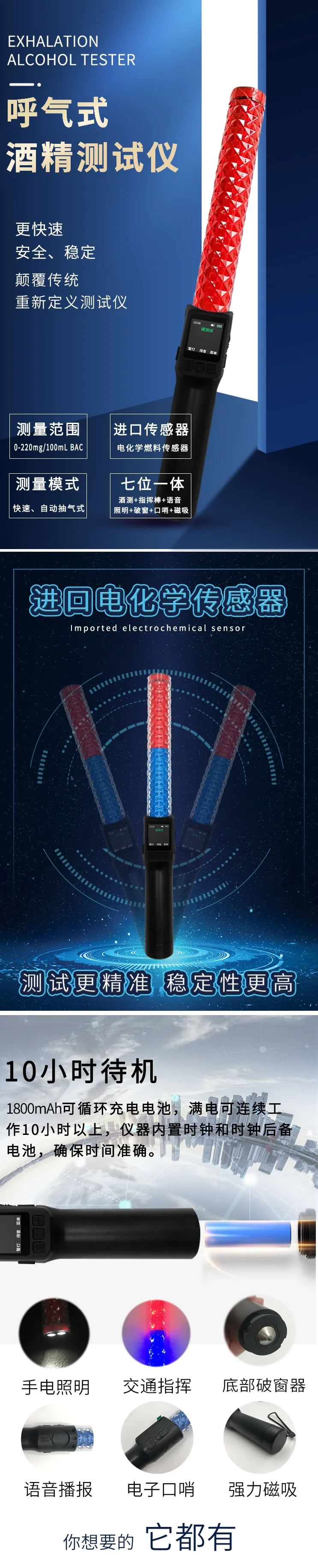 交警破窗多功能發光酒精(jīng)檢測器 酒精快檢指揮棒 電子警哨警用指揮棒 LED紅藍燈指揮棒