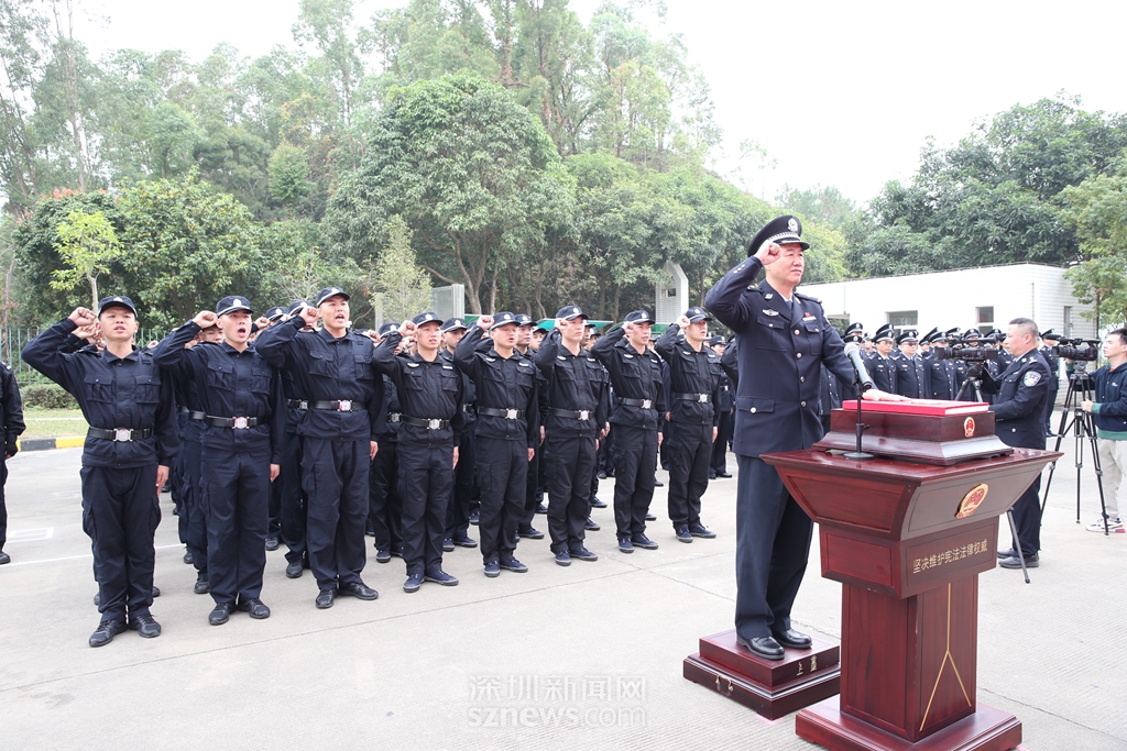 “我宣誓,忠於中華人民共和國憲法,維護(hù)憲法權威,履行法定職責,忠於祖國,忠(zhōng)於人民,恪盡職守,廉潔奉公,接受人民監督(dū),為建設富強民主文明和諧美麗的社會主義(yì)現(xiàn)代化強國奮鬥!”鏗鏘誓言,猶在耳(ěr)畔。活動中(zhōng),深圳監獄監獄長(zhǎng)蔡曙(shǔ)光,帶領70名(míng)新(xīn)入職警察麵對國(guó)徽、手撫憲法,許下了他們忠(zhōng)於祖國、忠於人民的錚(zhēng)錚誓言,這也是深(shēn)圳監獄對新入職警察(chá)開展集(jí)中的入職憲法(fǎ)宣(xuān)誓(shì)。深圳市司法局黨委委員、副局長任繼光對隊列會操高度讚揚。他說,剛才的隊列會操動作整(zhěng)齊、聲音洪亮,警(jǐng)棍術和特警隊表演氣勢威(wēi)武,展現了新時(shí)代特區監獄警隊的士氣和精神風貌。同(tóng)時,他對加入監獄警隊的70名新同誌表示祝賀,並送上(shàng)“旗幟鮮明講政治,立足崗位講奉獻,不斷提升講學(xué)習(xí),從嚴要求講自律”四(sì)句話,鼓勵新入職警察(chá)在“以人民為中心”發展理念的引領下,真正實現個人價值與集體價值的內在(zài)統一、個人追求與組織需要的高度融合、個人職業與監獄事業的同步發展。