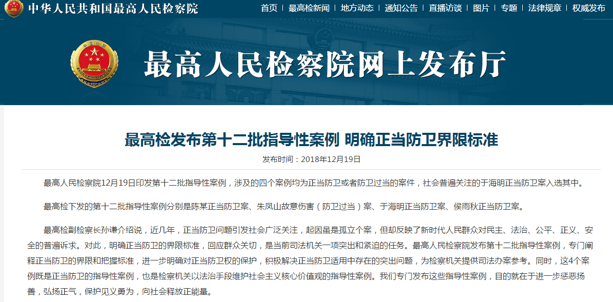 陳某(mǒu)正當防衛案(檢(jiǎn)例第45號)、朱鳳山故意傷害(防衛過當)案(檢(jiǎn)例第46號)、於(yú)海明(míng)正當防衛案(檢例第47號)、侯秋雨正當防衛案(檢例(lì)第48號)。