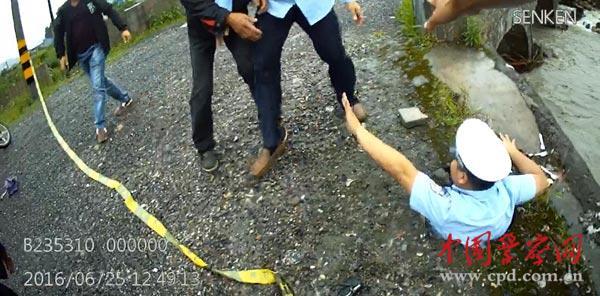 “撲——”當劉勇快要走到橋頭的欄杆附近時,他所站的水泥路麵突然下沉,劉勇本能的張開雙臂,正是這一動作,讓他卡在(zài)凹陷的水泥路麵上,沒有直接墜入激流中。“當時,我們正在設置警戒(jiè)線。聽到異響(xiǎng)後,我回頭(tóu)一看,發現劉所長掉進坑(kēng)洞裏(lǐ)去了,頓時心都提到嗓子眼上(shàng)來了。”回憶當時的情景,警察王小波仍是驚魂未定。當時王小波與劉勇(yǒng)的位(wèi)置最近,他攜帶的執法記錄儀完整地記錄了(le)當時的情景。“我立即(jí)拽住劉所長,並大(dà)聲呼(hū)救。”