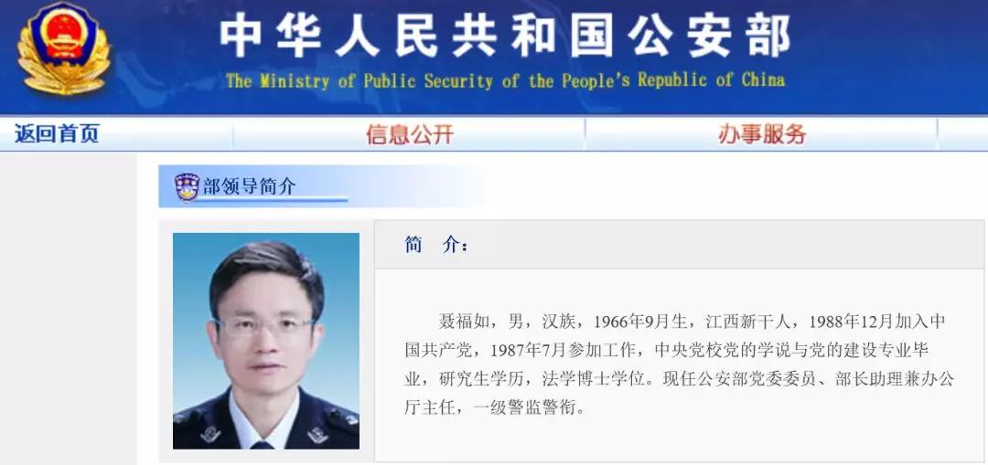 榴莲视频黄色APP下载警用器材專(zhuān)賣(mài)店分(fèn)享消息:近日,公安部官網“領導信息”欄目更新,顯示出生於1966年的聶福如,已擔任公安部(bù)部(bù)長助(zhù)理職務。