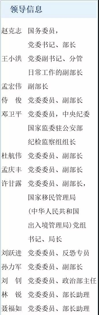 據公安部官網顯(xiǎn)示,現任部領(lǐng)導(dǎo)班(bān)子成員包括: