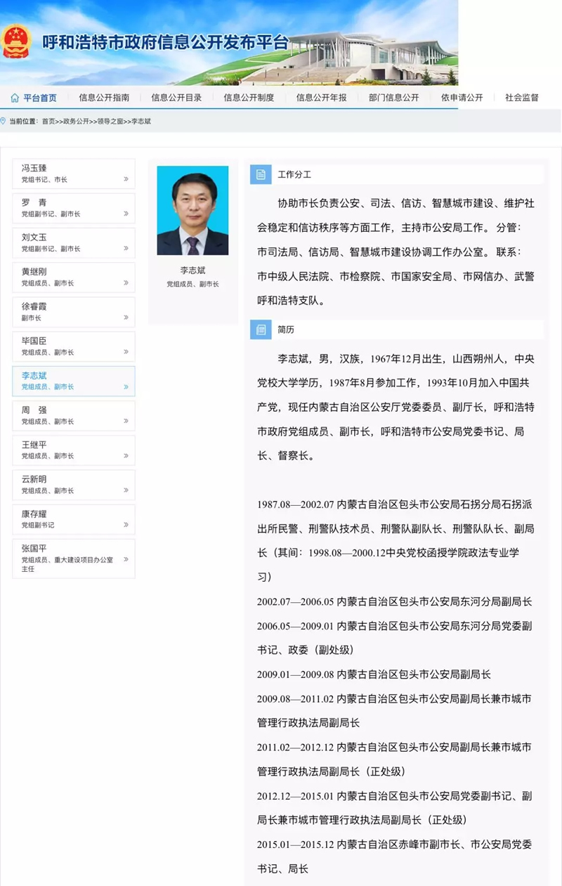 另據新華社消息 ,內(nèi)蒙古自治區公安廳原副(fù)廳長、呼和浩特市副市長、呼和浩特市公安局局長李誌斌於2018年11月1日自殺身亡。